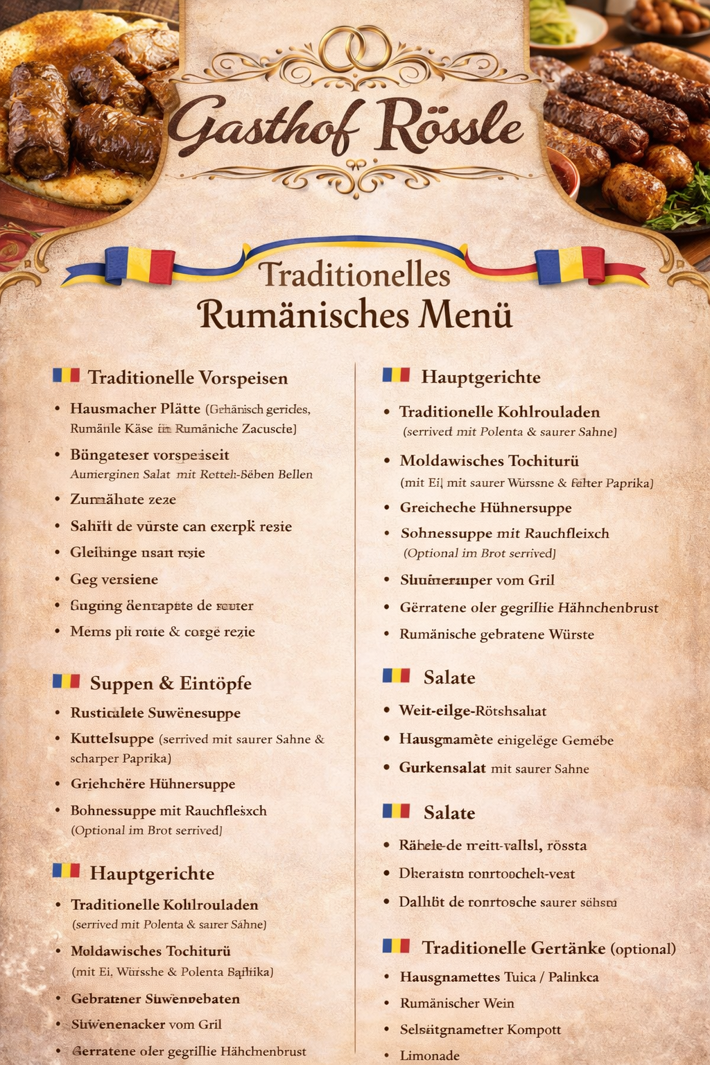 Dieses stilvoll gestaltete Menü präsentiert die Vielfalt und den authentischen Geschmack der rumänischen Küche. Unter dem eleganten Logo des Gasthof Rössle vereinen sich Tradition, Qualität und handwerkliche Kochkunst zu einem kulinarischen Erlebnis der besonderen Art.
