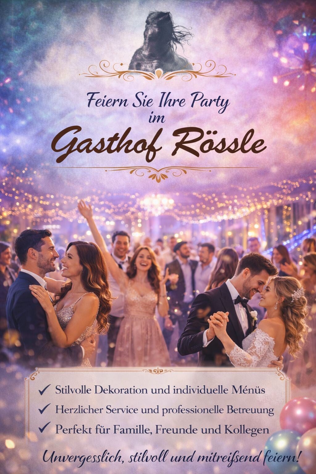 Im Gasthof Rössle wird jede Feier zu einem unvergesslichen Erlebnis. Eine elegante Atmosphäre, warme Lichter und stilvolle Dekorationen schaffen den perfekten Rahmen für emotionale und fröhliche Momente. Ob Hochzeit, Geburtstag, Familienfeier oder Firmenevent – wir verwandeln jeden Anlass in ein stilvolles und erinnerungswürdiges Fest.